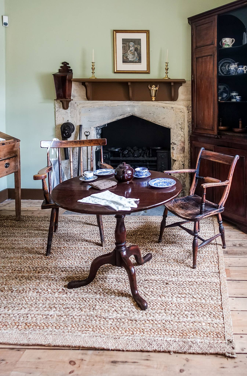 ▲写真2:バースで見学した18世紀の住宅の中の、召使の部屋。食卓の下には、しっかりとラグが敷かれていて、靴を脱ぎたくなるばかりか、思わず寝ころびたくなるような結界を作り出している。(クリックで拡大)