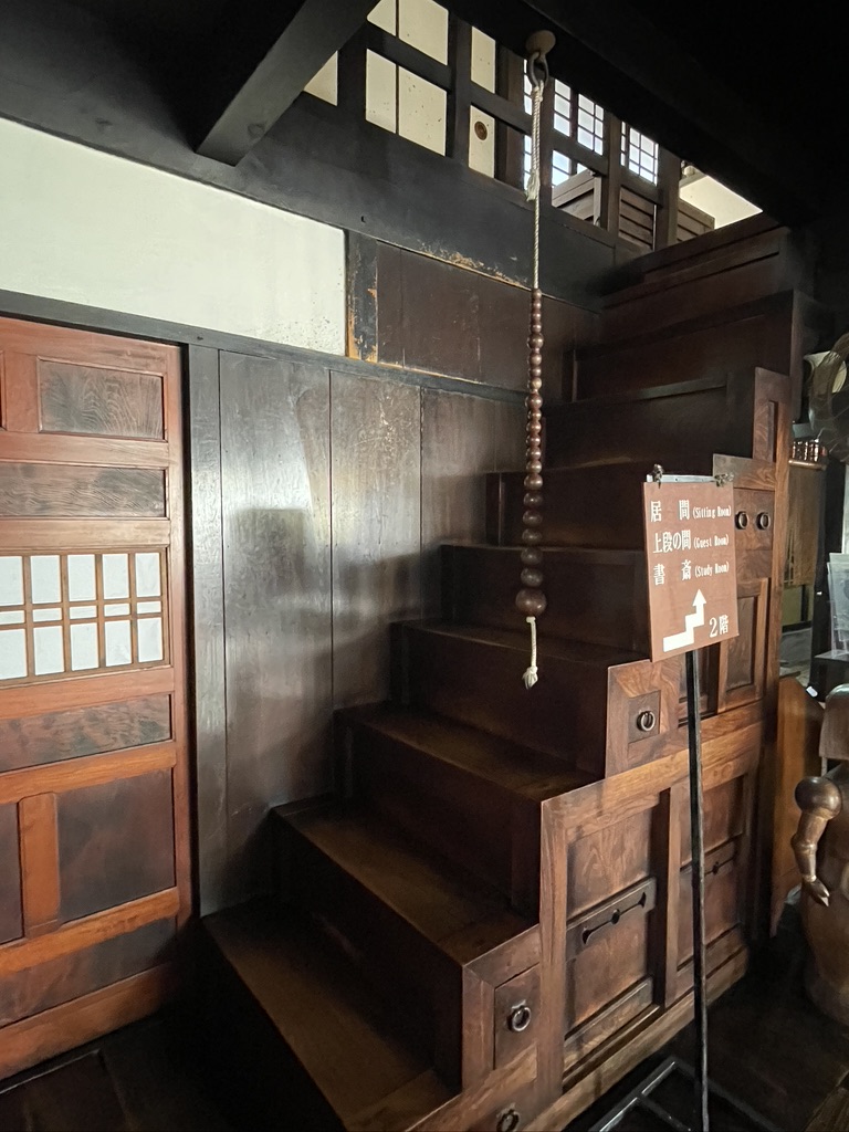 ▲河井寛次郎記念館より。2階へとつづく階段。2階床梁から吊されている数珠は手すりとしてつかわれている。(クリックで拡大)