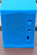 基本形はシンプルな直方体。スピーカーグリル部分は塗装された薄いステンレスシートであり、上面と下面は弾性素材のキャップになっている