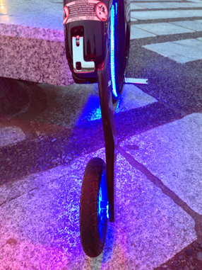 YikeBikeはニュージーランド生まれで、創業者のグラント・ライアンらが5年の歳月をかけて開発した。モデルはボディ素材の違いで、アルミ&コポジット製のフュージョン(14kg)、カーボンファイバー&&コポジット製のシナジー(12.7kg)、そしてカーボンファイバー製のカーボン(10.2kg)の3種類があり、今回試乗したのは、最上位のカーボンにロノフデザインが電飾カスタマイズを施した特別モデルである。