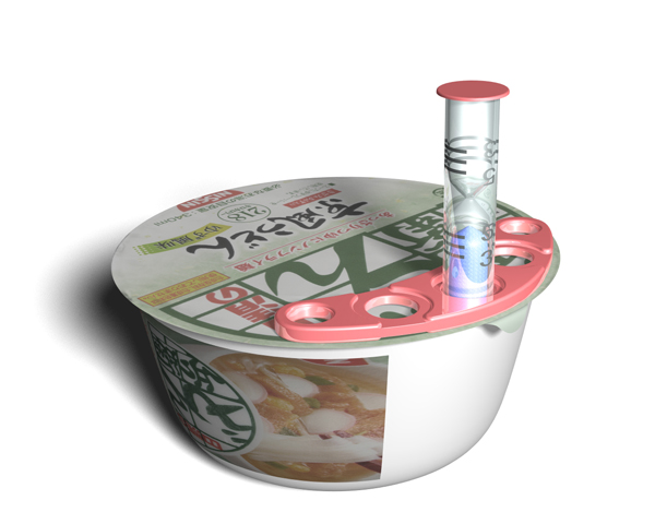佐々木彰男/神奈川県藤沢市 使用ツール:AliasStudio ホームページ:http://www.digicrafter.co.jp ○カップ麺に湯を注いだ時に、フタを押さえながら、茹で上がりの時間を計るスタイリッシュな砂時計。普通の砂時計と同じように、天地を逆にしてカップ麺のフタに載せると、三日月形の板が砂時計の外筒をスライドして重しとなり、フタがめくれるのを防ぐ。 目安として3、4、5分の目盛をつけてある。フタ押さえの部分は各サイズのカップ麺に使用可能、また箸置きとしても利用できる。 箸置きに |