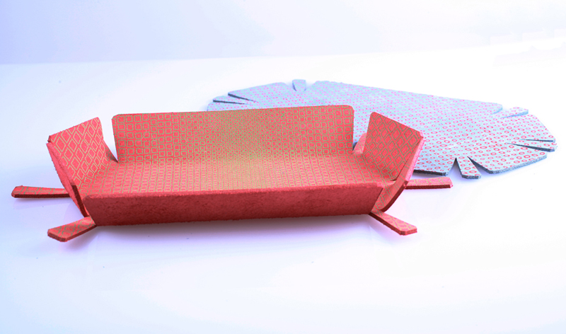 ○コンセプト:美濃和紙の可能性をもっと拡げるために、今までにあまり使用されていないシーンにもとけ込ませることを考えてデザインしたテーブルウェアです。「山のフードカバー」「道のランチョンマット」「川のはしおき」の3点のシリーズで、テーブル上に美濃の風景を再現するかのように演出できるテーブルウェアです。3つの商品すべて、四季をイメージした4カラーの展開になっています。