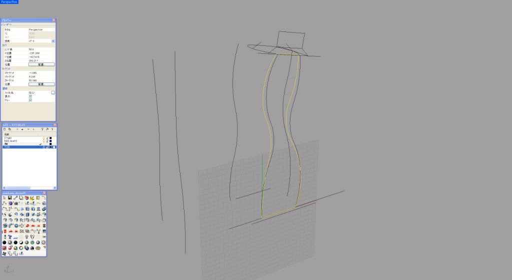 私いつものように基本は2次元で作成する。このデザインの場合、中央の帯状の2次曲面がポイントとなるため、この曲面のサイドのラインが、あとあとかなり重要な役割となってくる(画像1)。この2次曲面を90度前方向から見た曲線を設定する。この部分はボトルを握ったときに直接感じる厚みになるために、原寸で何度もプリントアウトして検討する必要がある(画像2)。 メニューから、「曲線」「二つのビューから曲線を作成」でこの2次曲面のアウトラインが出来上がる(画像3)。ここではこの面はシンプルに2レールで作成する。断面曲線は直線なので、あとあと問題になるような面はできにくいと予想される(画像4)。特に問題がなさそうな面なので、このまま作業を続ける。このワイヤーフレームの段階でラインが妙に多いと感じたときは、制御点を少なくするような作業が必要になってくる。問題がなければ、このまま中心線を軸としてミラーコピーする(画像5)。ミラーコピーしたものを、レンダプレビューでチェック。厚み具合も大丈夫そうなのでこのまま進める(画像6)。 ここからこの2次曲面をつなげる3次曲面の作成に入るのだが、まずは2レールでやってみようと思う。画像1の2次元での側面図の最大外形ラインをピークとして、両サイドの2次曲面とを結ぶ円弧を設定してみた。この3つの弧を断面とする2レールで面を張ってみる(画像7)。2レールで作成した面が画像8である。瞬間的に見ただけでちょっとバランスがよくないのが分かる。弧を設定した箇所はイメージどおりでも、最大外形ラインから実際の面が外れているのが正面図にすると確認できる。確認のため、もう一度この画像1での重要なカーブを観察してみる。このラインから外れるのはやはり造形上、致命的である。ここで2レールではなくネットワークサーフェスで面を張ることにしてみる。メニュー「サーフェス」「曲線ネットワークから面を作成」で先ほどの2つのレールと3つの弧に加えて最大外形ラインも選択して、ENTERで詳細設定BOXが現れる(画像9)。 画像10はネットワークサーフェスモードでの詳細設定BOX画面。注意するのは下部のエッジマッチングの部分がここだ。自分でそれぞれモードを試してみれば結果がすぐに把握できるので、是非時間があるときに試してほしい。今回は稜線をまずはしっかり出したいので、アルファベットの部分はすべて「位置」を選択してある。ネットワークサーフェスで作成した3次曲面。画像8と比較してみると、曲面がきれいに連続しているのが分かる。指定どおりの最大外形のラインも保ちながら狙い通りの造形が出来上がった。通常、あえて最大外形ラインを設定せずに、Rhinocerosの計算だけに頼って2レールで面を張ることも実は多いのだが、今回のようにサイドビューのシルエットが重要な要素となっているような造形の場合は、しっかりとネットワークサーフェスで面を構築したほうがよい。このあたりの判断は自分で経験値を広げていく以外にマスターできる方法はない(画像11)。 ここで反対側の面もネットワークで作成。ここまでくれば、もう機械的に作業を進められる(画像12)。これで筒状の4つの面を張り終えたことになる(画像13)。画面を回転させてバランスなどをチェック。この後、上面、底面を作成して一度ソリッド化させて金型屋さんにチェックをしてもらう。受け渡しはSTEPを用いた。今回は番組のほうで、なんと実際のボトルの金型まで作成し、中量生産の試作まで行うことができた。ボトルの口の部分の加工は金型メーカーさんにお願いし、稜線のRは実際の想定よりも一回り小さいRを設定するのが、ガラスの材料を使用したときのテクニックである(画像14)。 Rhinoceros上ではレンダリングをプレビューで見せながらの打ち合わせをして、非常にスムーズにメーカーや企画サイドとのコミュニケーションがとれた(画像15)。